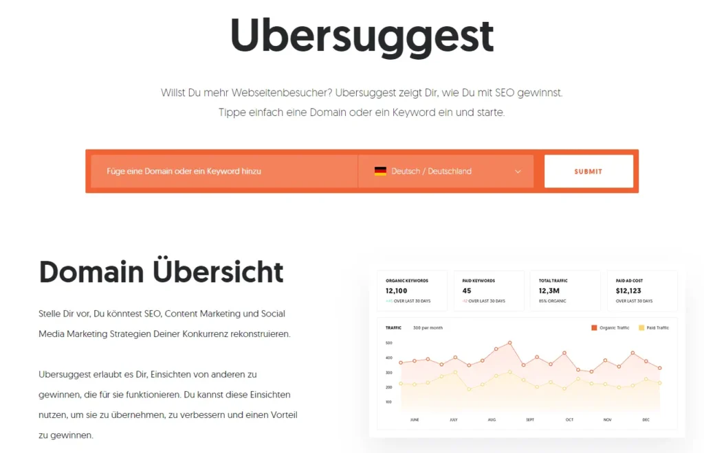 Darüber hinaus kannst du mit Ubersuggest nicht nur deine eigene Webseite analysieren, sondern auch die Strategie deiner Konkurrenten genauer verstehen. Diese Erkenntnisse ermöglichen es dir, deine eigene Content-Planung gezielt zu optimieren und dich im Wettbewerb besser zu positionieren.